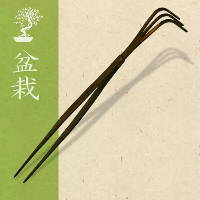 Bonsai harkje met pincet wordt gebruikt om de boven laag van een pot weg te krabben, om oude wortelstrukturen bloot te leggen. Ook kunt u hiermede de wortels uitkrabben en vrij te maken om bij te snoeien. Het is een essentieeel instrument