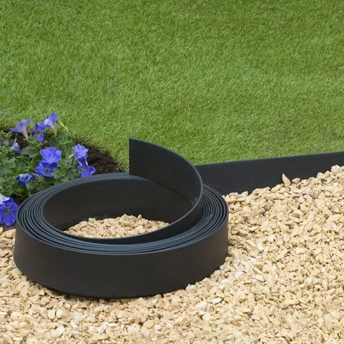 Afgeronde rand van flexibel polyurethaan. Deze rand volgt perfect de gebogen en geometrische vormen van doorgangen, bloemperken, gazons, paden en vijvers.