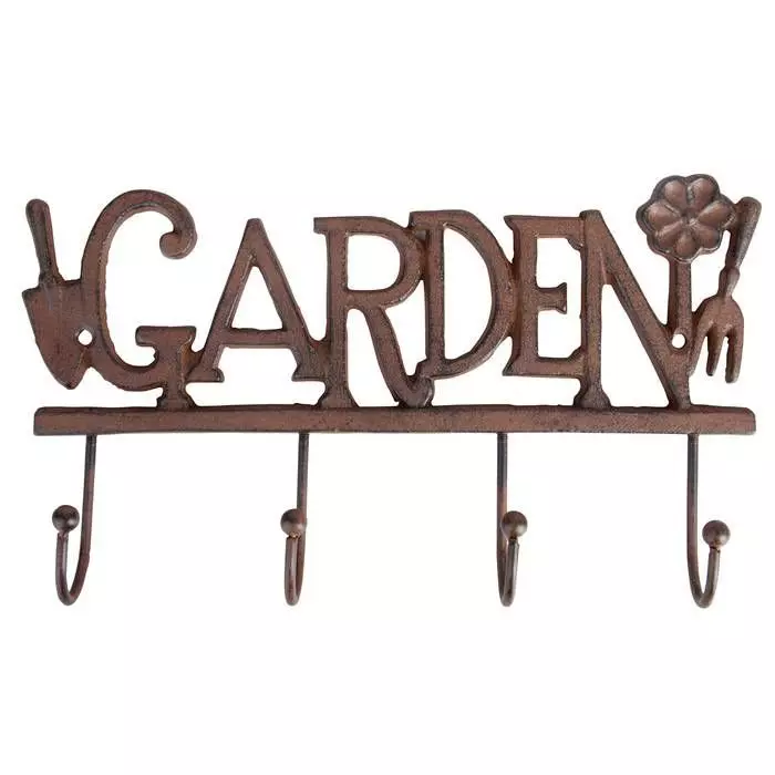Gietijzeren wandplaat met tekst “Garden” en 4 haken.