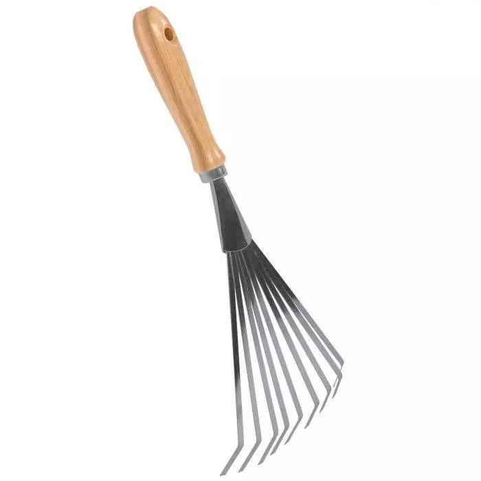 Dit handharkje is geschikt voor het verzamelen van bladeren en tuinafval bijvorbeld uit uw potten en bloembakken. Het handharkje is geproduceerd uit verzinkt staal wat roesten tegengaat en hierdoor dus een langere levensduur heeft. Aan het harkje zit een steel van 12,5cm van gewaxt hout, dit zorgt ervoor dat het hout kan ademen en geen water en vuil opneemt, en dus langer mee gaat.