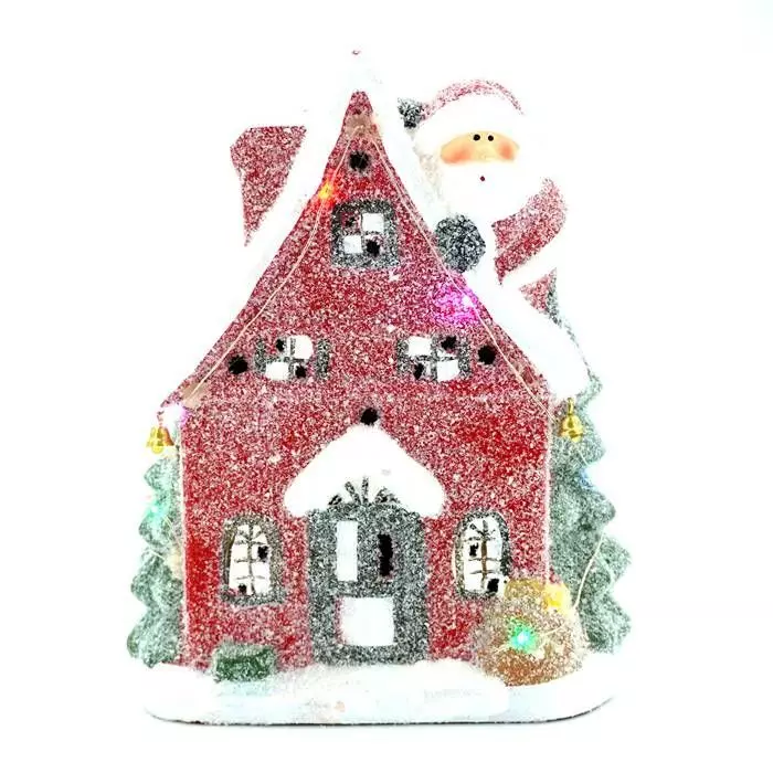 Het kersthuisje met sneeuw krijgt een bezoekje van de kerstman. Het kersthuisje is inclusief verlichting en batterijen, de lampjes veranderen van kleur. Een prachtig winter wonderland als kerstversiering.