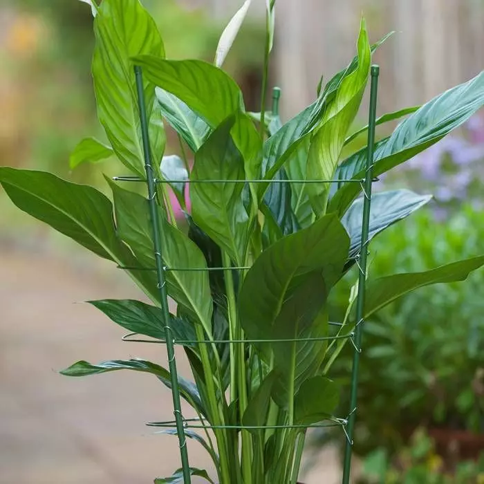 Ronde plantensteun van groen geplastificeerd verzinkt staal ter ondersteuning van planten, te beverstigen op een plantenstok.