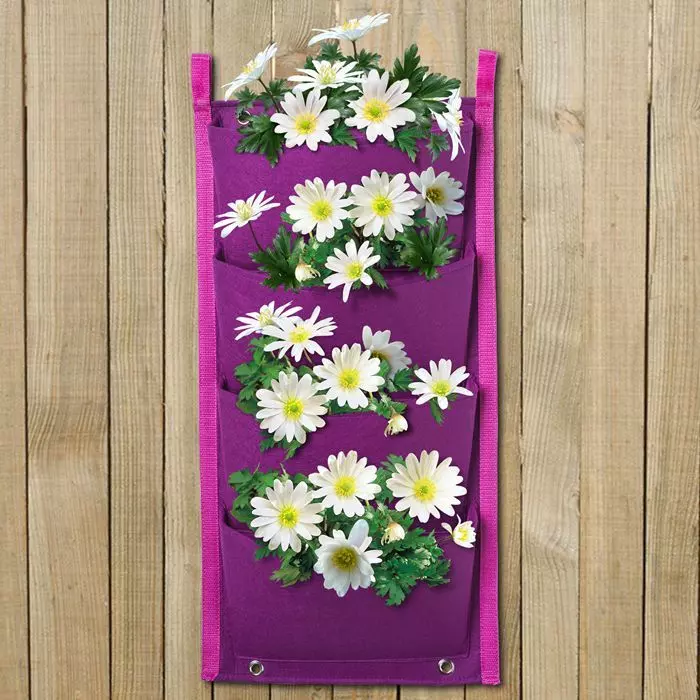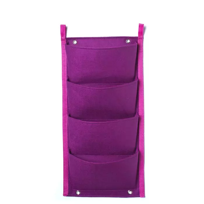 Plantentas van vilt met vier vakken voorzien van vier ogen om makkelijk aan de muur te bevestigen en twee bevestigingsstukken om aan te brengen op een balkon.