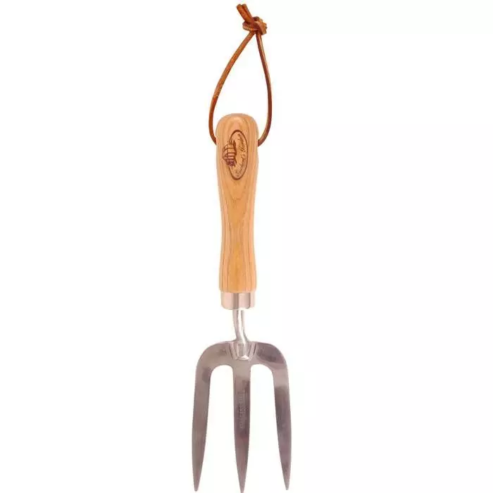 Plantvorkje van RVS en handvat van essenhout. Voorzien van een leren ophanglusje. Gemaakt van dik staal, bijzonder sterk verbuigt niet