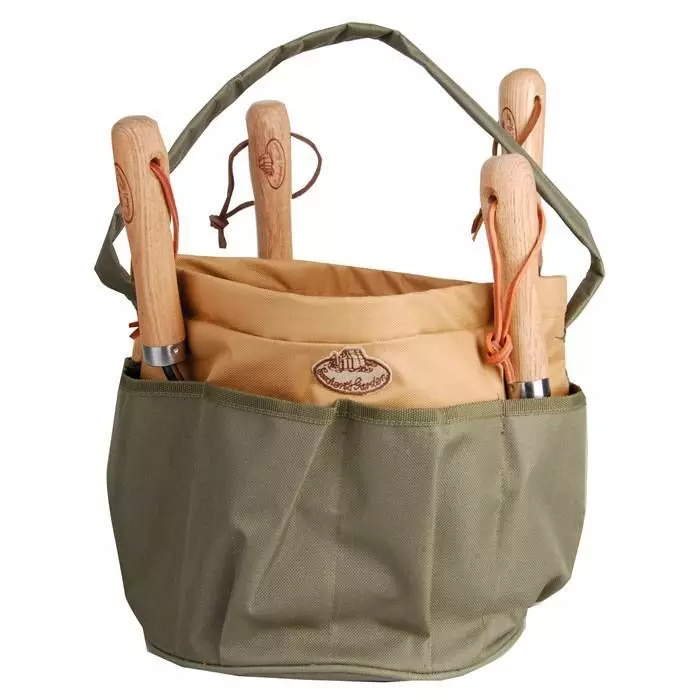 Stevige ronde kaki- en olijfgroene tuingereedschaptas met stevig handvat en meerdere ruime zijvakken voor het eenvoudig opruimen van uw tuingereedschap.
