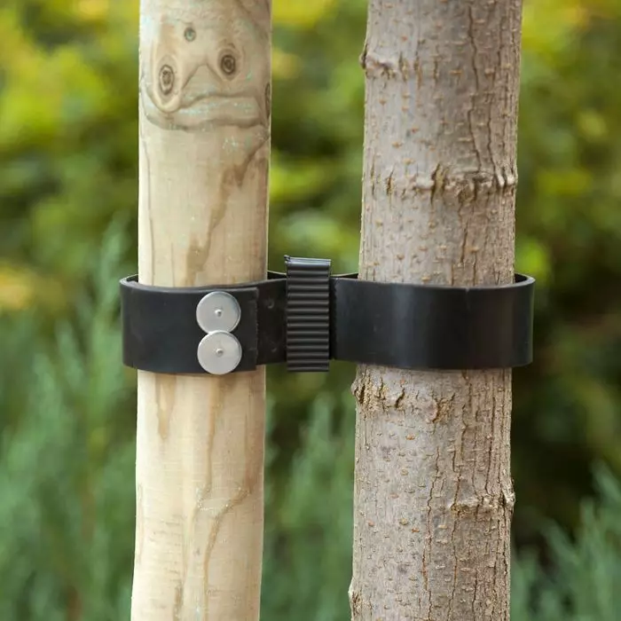 Rubber/canvas boomband met canvas binnenlaag, en een verstelbare sluiting voor bevestiging. Band vast te spijkeren aan de steun.