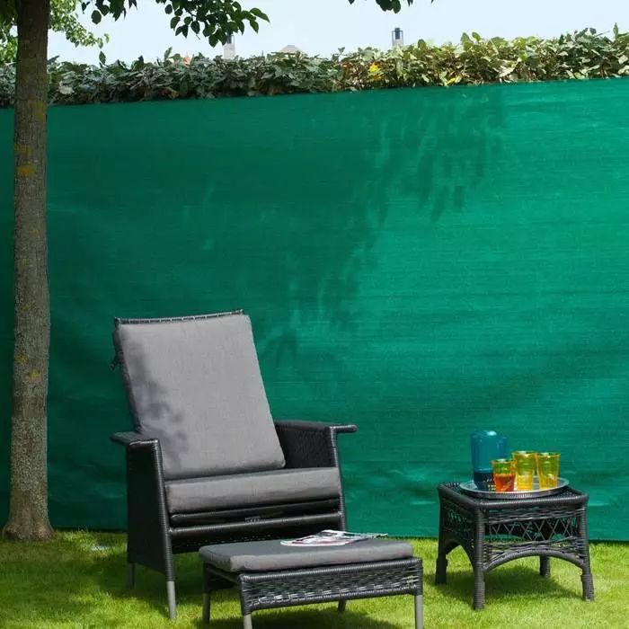 Schermgaas te bevestigen aan een omheining, van geweven groen polyethyleen, uv-bestendig en met een dichtheid van 190 g/m². Afschermgraad van 95%. De speciale structuur zorgt ervoor dat het doek laddervrij is. Geleverd met bevestigingsset (26 bevestigingsstukken en 4 meter geplastificeerd verzinkt ijzerdraad.