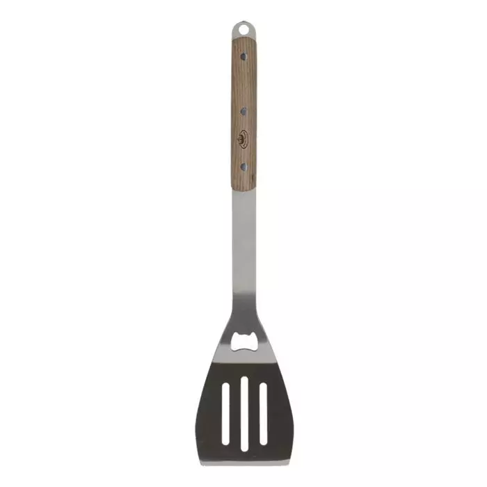 Met deze spatel draai je vlees, vis en groenten op de barbecue gemakkelijk om. De spatel heeft een handig oog, waarmee je de tang kan ophangen. Ook beschikt deze spatel over een flesopener, zo draai je niet alleen gemakkelijk het vlees op, maar open je ook gemakkelijk flesjes.