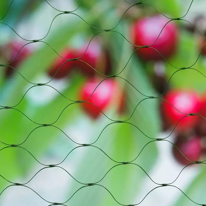 Tuinnet Nano. Dit groene net is van polyethyleen, is uv-bestendig en heeft een dichtheid van 10g/m². De mazen hebben een opening van 15mm en de draden hebben een dikte van 15 tot 16 µ. Het net kan meerdere malen gebruikt worden.