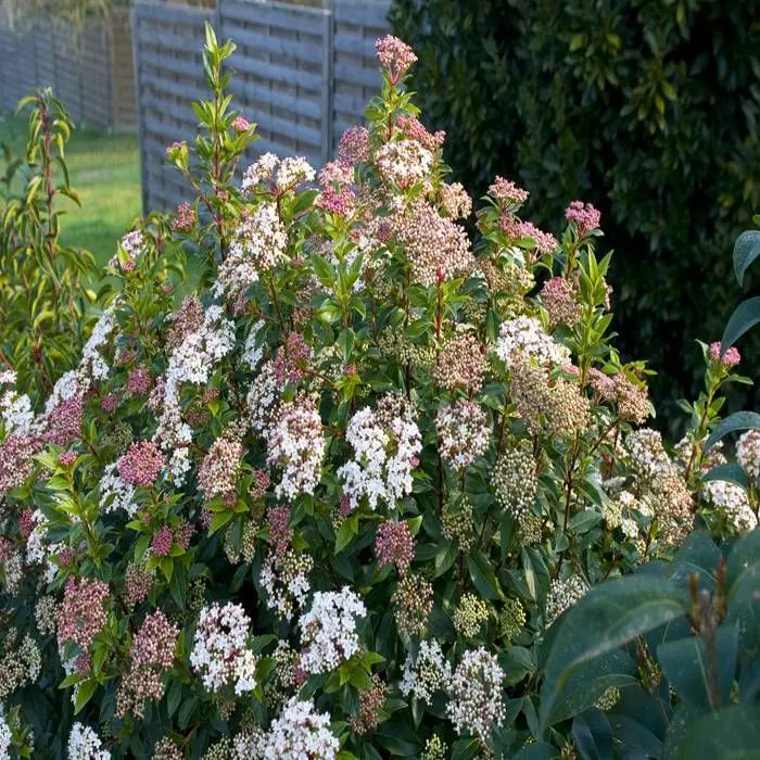 Voor de bloei vormt deze viburnum mooie roze bloemknoppen, die overgaan in helder witte samengestelde bloemen. Na verloop van tijd vormen zich donkerblauwe bessen.
